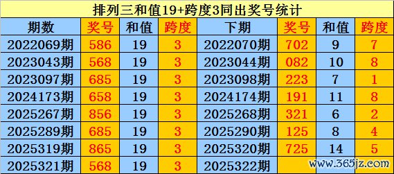 胪列三近8次和值19+跨度3同出时奖号为:586、568、685、658、856、685、865、568,下期鉴识出现:702、082、223、191、321、125、725。